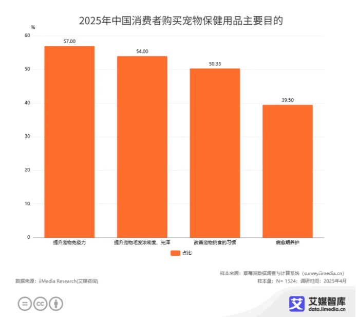 在这个蓬勃发展的巨大市场中,消费者的需求正变得前所未有的具体和清晰。iiMedia Research(艾媒咨询)调研数据精准地揭示了驱动这一消费升级的核心动力——对宠物健康的极致关注。在2025年中国消费者购买宠物保健用品的主要目的中,“提升宠物免疫力”以57.0%的占比高居首位,而紧随其后的便是“提升宠物毛发浓密度、光泽”,占比高达54.0%。宠主们的健康管理诉求已从泛泛而谈,延伸至包括毛发健康在内的具体、可视化的指标。健康的毛发不仅是美观的需要,更是宠物整体健康状况的外在体现,因而成为了超过半数宠主的主动、核心消费目标。